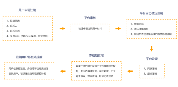 首先由用戶自己發(fā)起注銷申請(qǐng),填寫(xiě)資料,平臺(tái)審核身份,確認(rèn)無(wú)誤后,平臺(tái)采取賬戶凍結(jié)處理,在七天的凍結(jié)期限內(nèi),用戶可以撤銷注銷申請(qǐng),若無(wú)疑問(wèn),七天凍結(jié)期結(jié)束后,賬戶自動(dòng)進(jìn)入凍結(jié)期,無(wú)法登陸。后續(xù)用戶若再次登陸會(huì)提示無(wú)法登陸,且該身份證信息無(wú)法重新注冊(cè),若再次需要服務(wù),只能聯(lián)系駝鈴云客服(400-806-8706)處理。