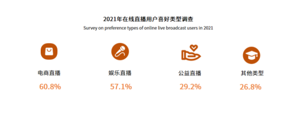 觀看直播的用戶有60.8%喜歡看電商直播,其次是娛樂直播,有超五成的用戶喜歡。自2020年初疫情開始,線下活動(dòng)受制,多地都開始使用直播形式幫助經(jīng)濟(jì)產(chǎn)業(yè)恢復(fù),使得公益直播以及助農(nóng)直播等也逐漸被網(wǎng)民所關(guān)注。