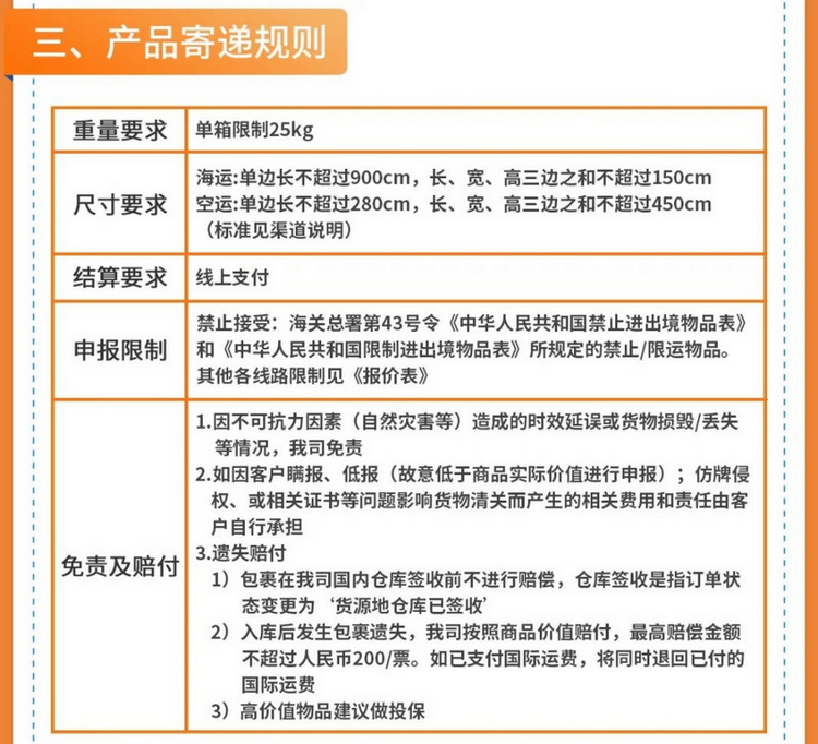 具體寄遞規(guī)則方面,重量要求,單箱限制25kg。尺寸要求:海運(yùn),單邊長不超過900cm,長、寬、高三邊之和不超過150cm;空運(yùn),單邊長不超過280cm,長、寬、高三邊之和不超過450cm。下附完整寄遞規(guī)則: