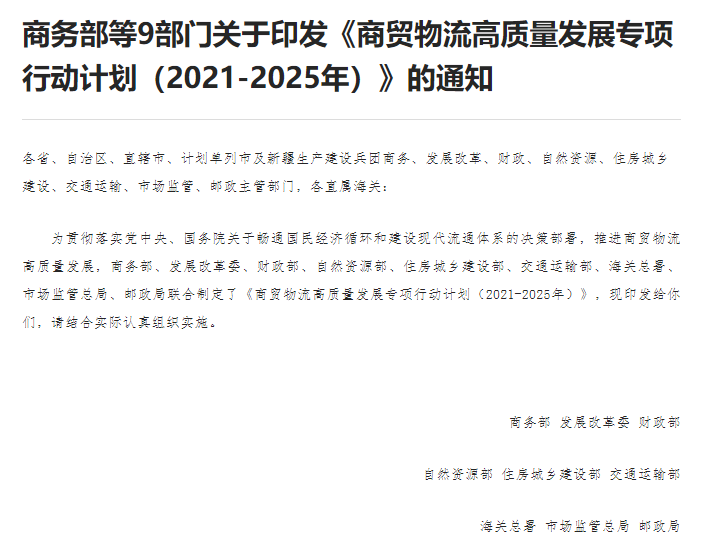 近日,商務(wù)部等9部門(mén)聯(lián)合印發(fā)《商貿(mào)物流高質(zhì)量發(fā)展專項(xiàng)行動(dòng)計(jì)劃(2021-2025年)》(商流通函〔2021〕397號(hào),以下簡(jiǎn)稱《計(jì)劃》),在全國(guó)范圍內(nèi)部署開(kāi)展商貿(mào)物流高質(zhì)量發(fā)展專項(xiàng)行動(dòng)(以下簡(jiǎn)稱專項(xiàng)行動(dòng)),引起社會(huì)各界廣泛關(guān)注,為回應(yīng)地方、企業(yè)、媒體以及群...