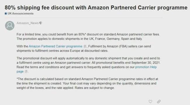 近期,亞馬遜歐洲站宣布將推出合作承運商8折運費優(yōu)惠,該活動將持續(xù)到2021年9月30日,適用于英國、法國、德國、西班牙、意大利的國內運輸。公告內容如下: