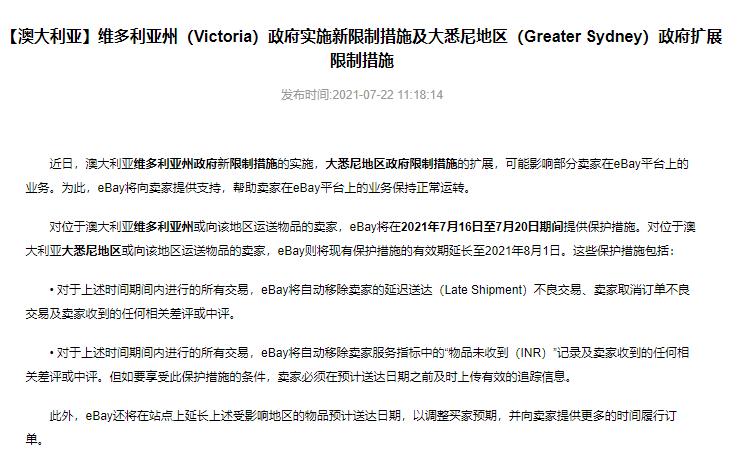 對位于澳大利亞維多利亞州或向該地區(qū)運送物品的賣家,eBay將在2021年7月16日至7月20日期間提供保護措施。對位于澳大利亞大悉尼地區(qū)或向該地區(qū)運送物品的賣家,eBay則將現(xiàn)有保護措施的有效期延長至2021年8月1日。具體公告內容如下: