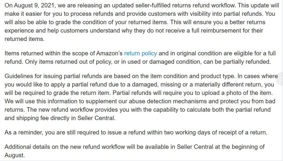 也就是說退款份額的多少基于退貨商品的狀況和類型。如果您遇到買家因產品出現(xiàn)損壞、丟失或嚴重與實物不符而想申請部分退款的情況,您可以選擇對退貨產品進行評分。部分退款將要求您上傳所退產品的照片。我們將通過您上傳的照片信息來輔助檢測機制并保護您免受不良退貨的影響。新的退款工作流程使您能直接在賣家中心計算部分退款金額和所需運費。注意:您仍需在收到買家退貨申請的兩個工作日內退款。以下為公告原內容: