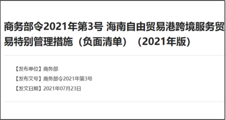 經(jīng)國(guó)務(wù)院審定,商務(wù)部發(fā)布《海南自由貿(mào)易港跨境服務(wù)貿(mào)易特別管理措施(負(fù)面清單) (2021年版)》,這是我國(guó)在跨境服務(wù)貿(mào)易領(lǐng)域公布的第一張負(fù)面清單!再次彰顯我國(guó)開(kāi)放的力度和深度!負(fù)面清單僅包括11類(lèi)70項(xiàng)特別管理措施,負(fù)面清單外的領(lǐng)域在海南自貿(mào)港內(nèi)按照境...
