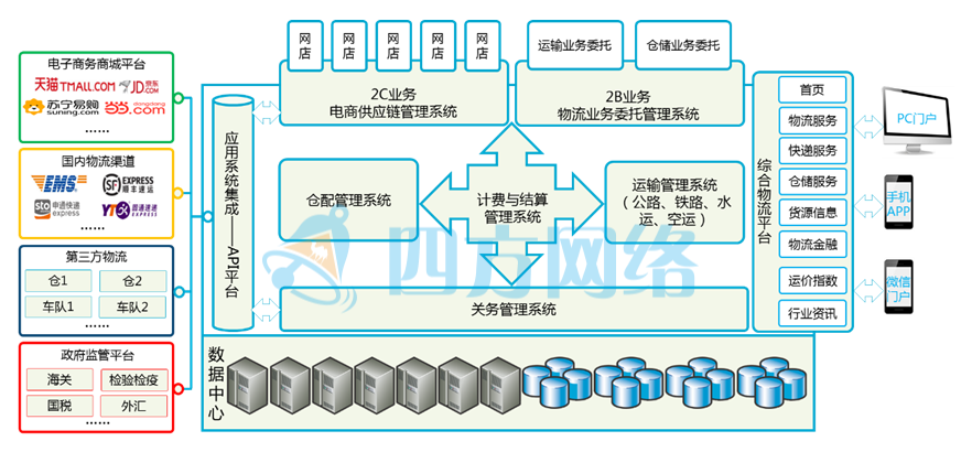 建設(shè)6系統(tǒng)2平臺支撐綜合物流服務(wù),并與電子商務(wù)平臺、物流渠道、政府監(jiān)管平臺互聯(lián)互通。